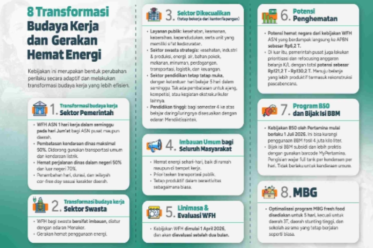 Dalam pemaparan materi, dijelaskan delapan poin utama transformasi budaya kerja, di antaranya penerapan Work From Home (WFH) satu hari dalam seminggu bagi aparatur sipil negara setiap hari Jumat. Selain itu, terdapat pembatasan penggunaan kendaraan dinas hingga 50 persen, serta pengurangan perjalanan dinas dalam negeri sebesar 50 persen dan luar negeri sebesar 70 persen.
