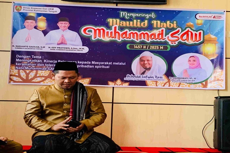Palangka Raya – Keluarga Besar Dinas Koperasi, Usaha Kecil, dan Menengah (Diskop UKM) Provinsi Kalimantan Tengah menggelar peringatan Maulid Nabi Muhammad SAW di Aula Kantor Diskop UKM, Senin (8/9/2025).
