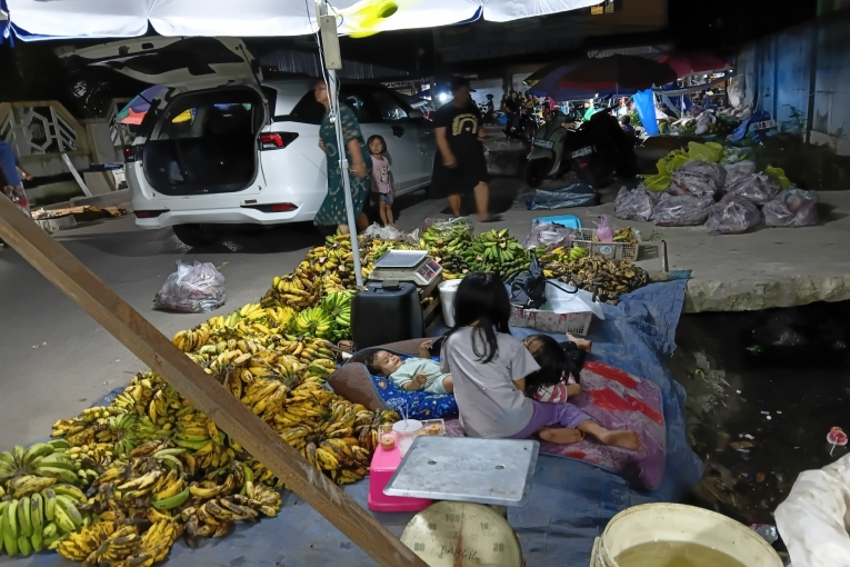Kedua anak kecil itu dan adik bungsunya tetap setia menanti kehadiran Ibunya untuk kembali, sembari berharap dagangan pisangnya segera laku agar mereka bisa segera pulang ke rumah untuk beristirahat.